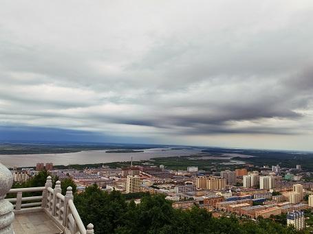 行至半山腰,天空突然阴沉下来,刚才还光芒四射的太阳渐渐被厚重的云层吞噬。我们站在半山腰,望着被云层遮蔽的太阳,心中不免升起一丝遗憾。但转念一想,这何尝不是大自然给我们上的一堂生动的气象学课?最终,我们带着些许遗憾登上了东极阁,从这里俯瞰,黑龙江与乌苏里江如两条巨龙般蜿蜒东去,在抚远三角洲汇合成一片浩瀚的水域,这便是地理学上著名的"两江交汇"奇观。