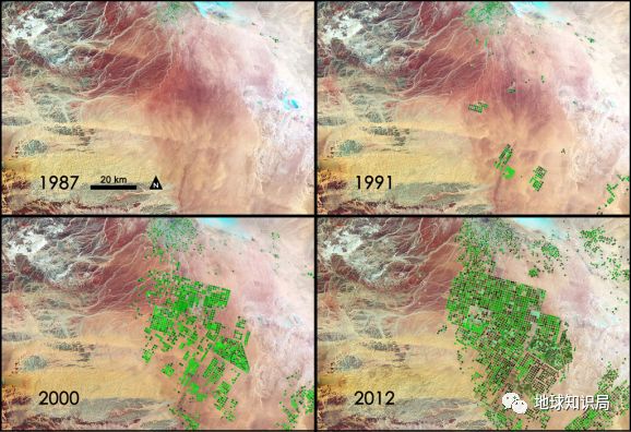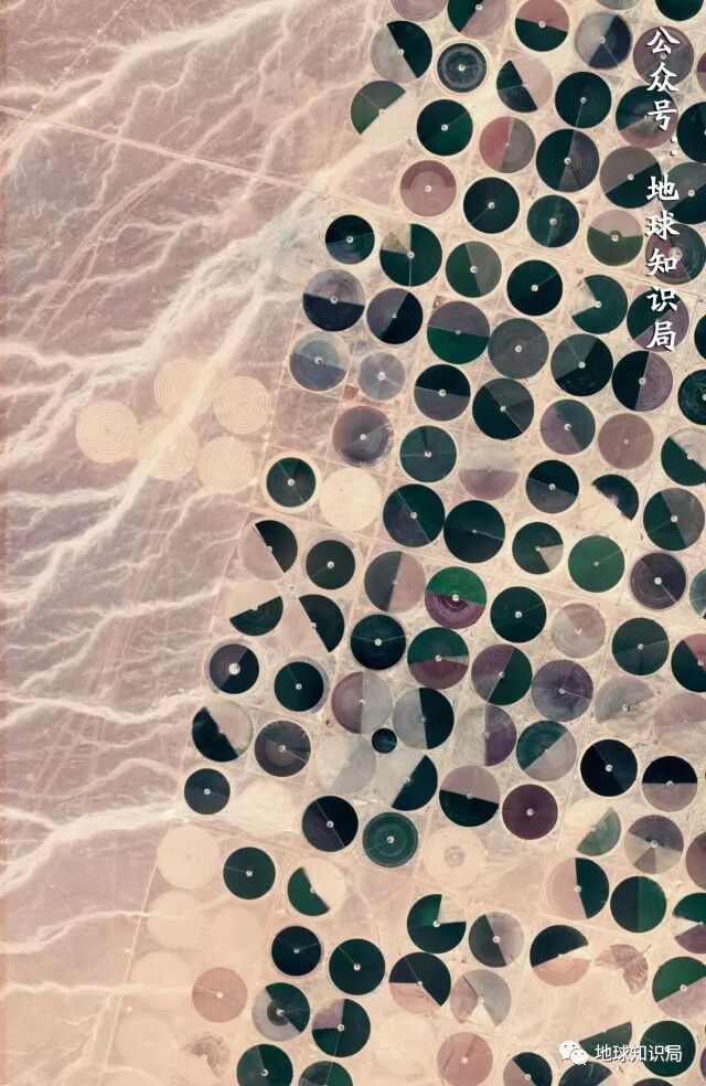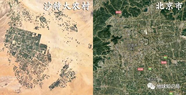 当我局在观察沙特阿拉伯半岛时,在沙特阿拉伯北部靠近约旦边境的Tubarjal市附近的荒漠中发现了一大片奇怪的绿色。再放大仔细一看,好大一块农场,而且有北京这么大?!虽然是一小点,其实蛮大的