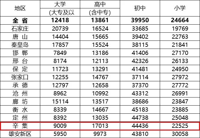 河北全省各市(含定州、辛集市)、雄安新区的每10万人口中拥有的各类受教育程度人数有关数据: