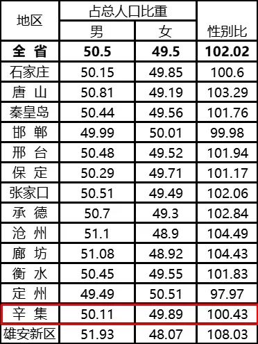河北全省各市(含定州、辛集市)、雄安新区的人口性别构成有关数据: