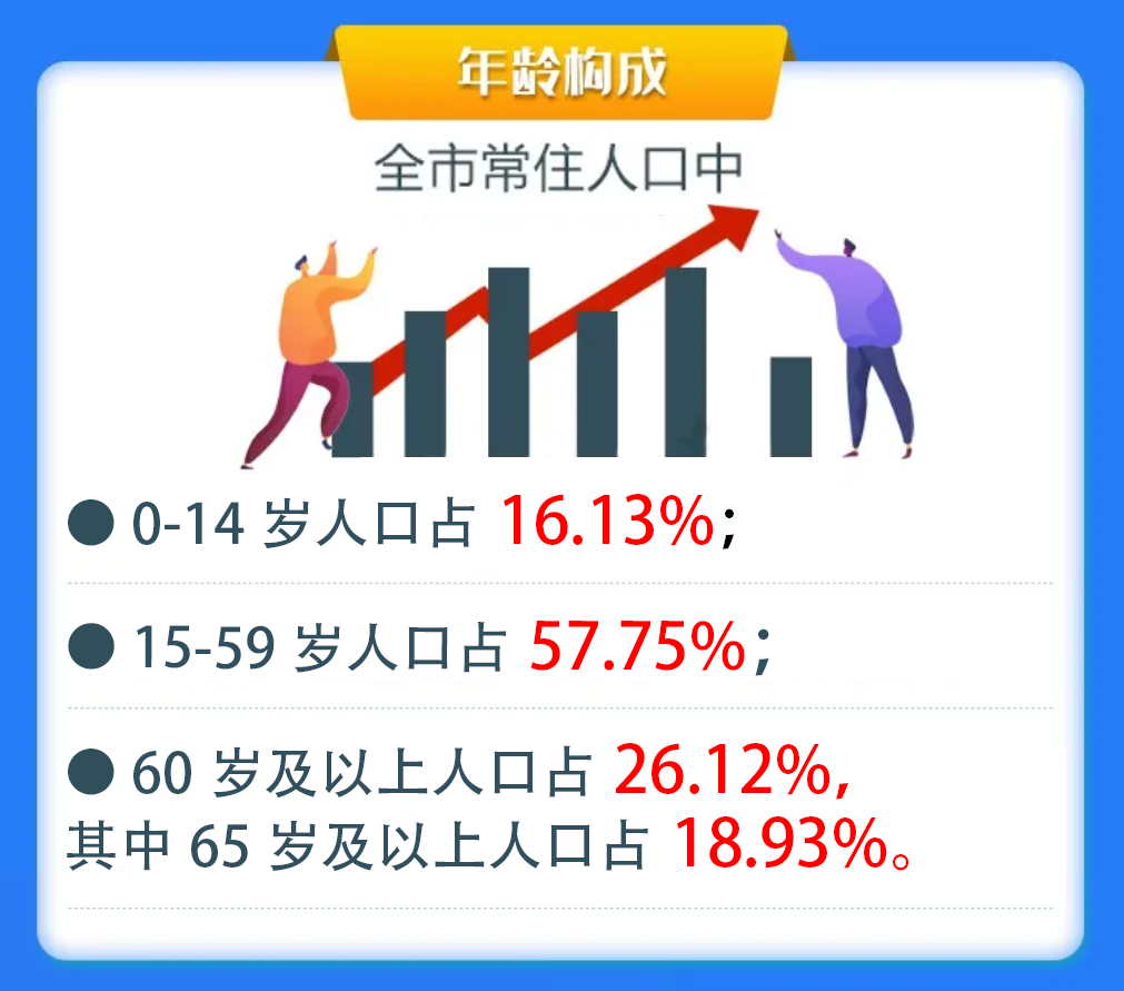 [size=0.8](五)年龄构成。0—14岁人口为25338万人,占17.95%;15—59岁人口为89438万人,占63.35%;60岁及以上人口为26402万人,占18.70%(其中,65岁及以上人口为19064万人,占13.50%)。与2010年相比,0—14岁、15—59岁、60岁及以上人口的比重分别上升1.35个百分点、下降6.79个百分点、上升5.44个百分点。我国少儿人口比重回升,生育政策调整取得了积极成效。同时,人口老龄化程度进一步加深,未来一段时期将持续面临人口长期均衡发展的压力。